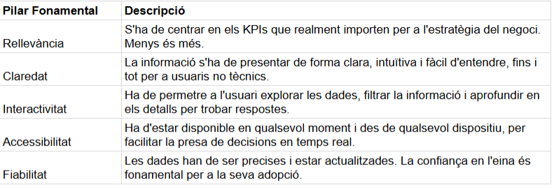Perquè un dashboard sigui realment útil, ha de complir una sèrie de requisits. No es tracta d’acumular gràfics, sinó de dissenyar una eina que faciliti la presa de decisions. A continuació, es detallen els pilars fonamentals d’un dashboard estratègic d’èxit.